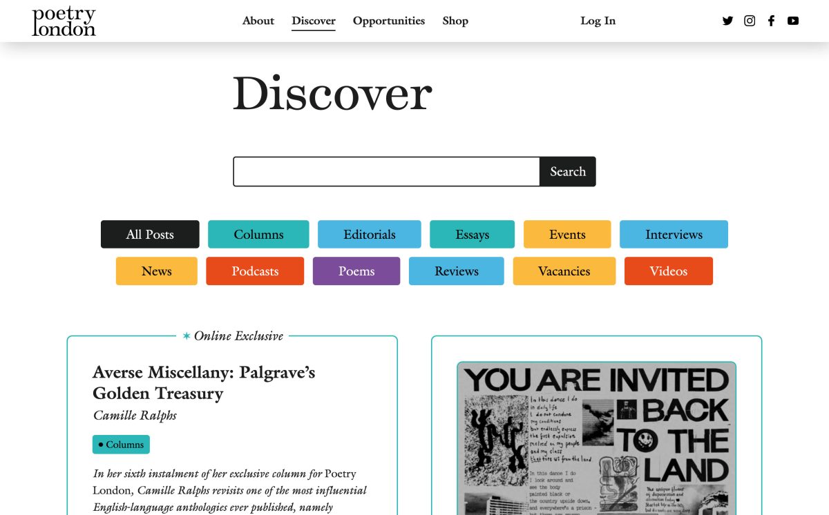 Led by this elegant and thoughtful aesthetic developed by designer Hannah Phillips and Poetry London themselves, we worked with the team to devise a new digital home that would consolidate an extensive body of content into four core sections. These in turn were cultivated to inspire each and every user to explore and discover the wealth of archival content on offer, whilst broadcasting the myriad of ways to support and engage with the magazine and ‘be a part of the next 100 issues’!